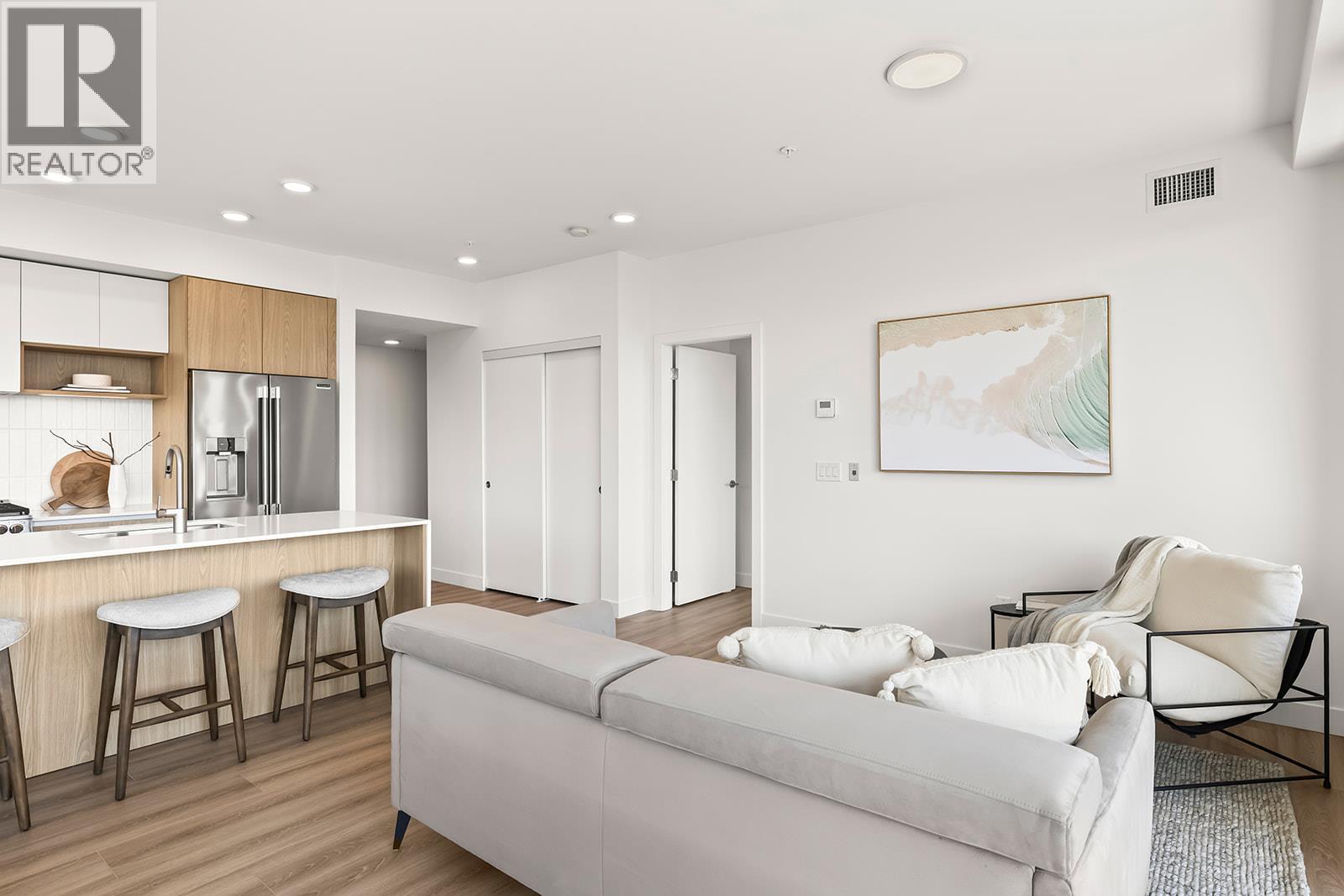 This BRAND NEW, never been lived in, 2 bedroom + den, 2 bathroom, corner-unit is an exceptional blend of sophistication, comfort, and design. Expansive balconies with glass railings frame your panoramic lake, pasture and vineyard views - while inside, floor-to-ceiling windows flood the space with natural light. The chef’s kitchen is a showpiece with an oversized eat-up Island draped in glistening quartz with waterfall-edge, gas cooktop, built-in wine fridge and microwave, custom drawer organizers and grounded with elegant luxury vinyl plank flooring. The generous-sized bedrooms are positioned on opposite sides for added privacy. Retreat to the primary suite and enjoy million-dollar views, a walk-through closet with custom built-ins, and a spa-inspired ensuite complete with heated tile floors. Thoughtfully designed to impress, this exquisitely crafted home includes TWO oversized decks, TWO parking stalls, TWO storage spaces and allows TWO pets! Harvest your own food, year-round in the onsite Greenhouse complete with hydroponics and irrigation. Secure parcel delivery, cutting-edge Butterfly access system, outdoor pool and hot tub, fitness centre, dog wash station and community gardens, add to the elevated amenities. Perfectly situated steps to the brand new community centre, private school, sports courts, bistro, and market - and just minutes from beaches, boat launches, and world-renowned wineries - this is modern Okanagan living at its finest. (id:4069)