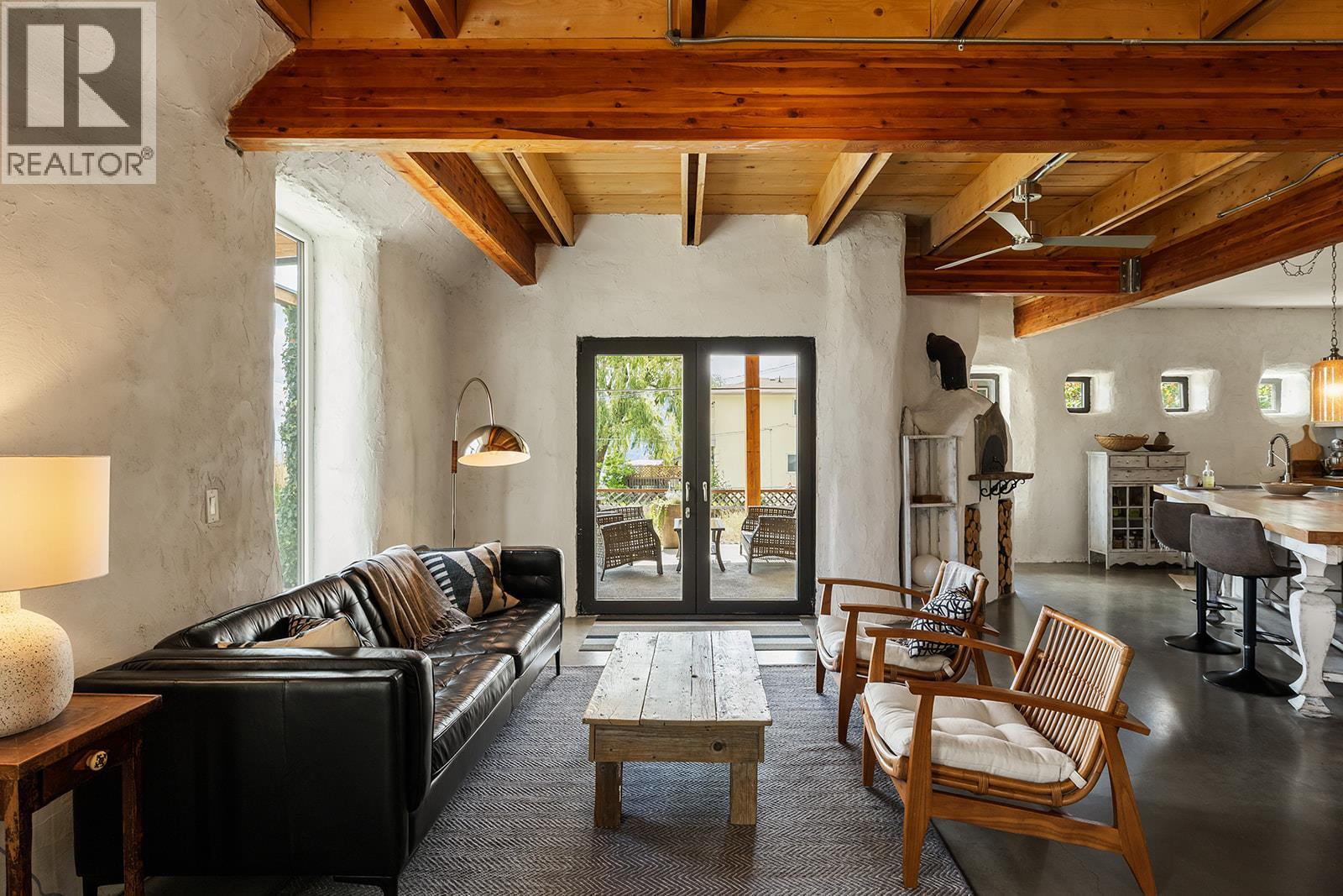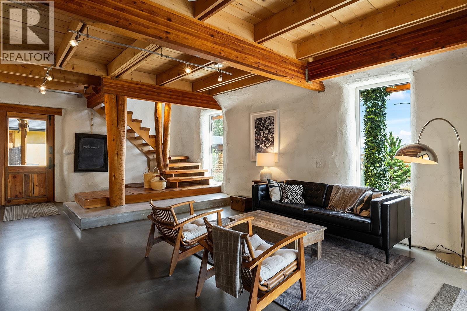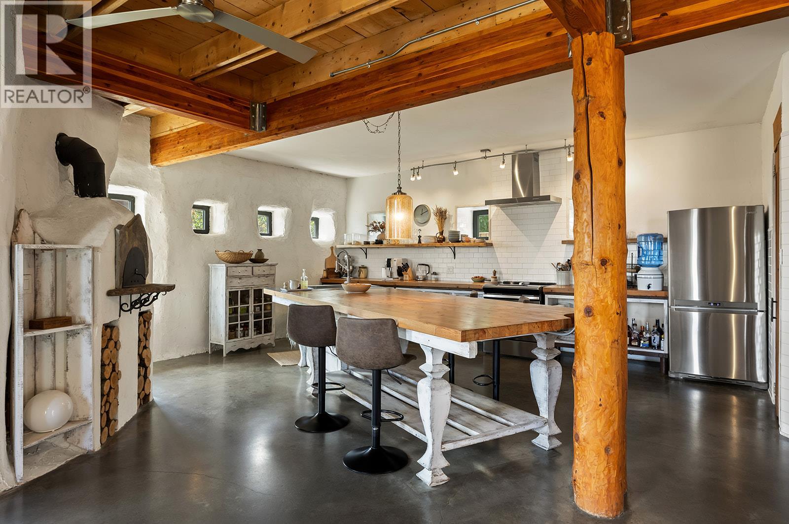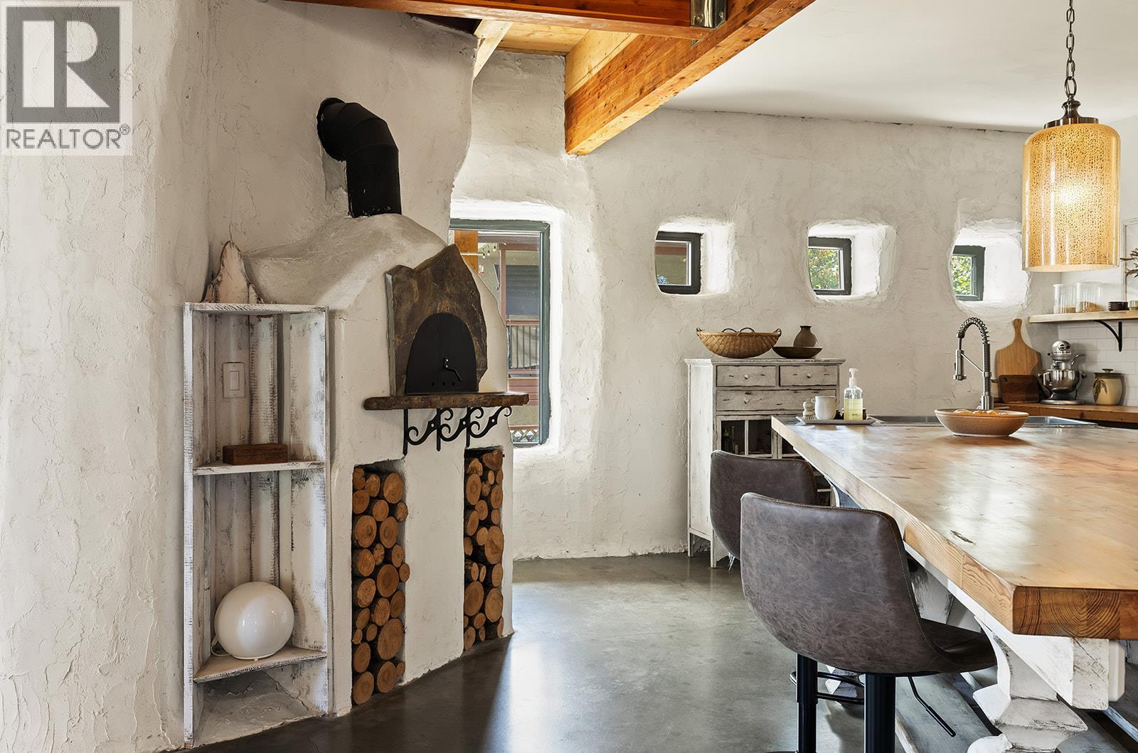 This one of a kind timber-frame straw-bale home blends architectural beauty with exceptional energy efficiency. Thoughtfully designed and extensively upgraded, this residence delivers remarkable heat retention and year round comfort with extremely low operating costs, averaging just three cords of wood annually for heating. The home features a Blaze King wood stove with long burn times, hydronic in floor heating on the main level, dual heat pumps for heating and cooling, and high performance tilt turn Innotech windows and doors. The ICF concrete slab, 18 inch straw bale walls, and reclaimed wood flooring naturally regulate temperature throughout the home, with upper level floors back beveled to allow warm air circulation. The kitchen showcases a wood fired Forno pizza oven, massive eat up island and apron sink, while the spa inspired main bathroom offers a 2025 tiled walk in shower, bidet, and in floor heat. Outdoors you will find a large covered patio, solar heated saltwater lap pool, veranda, newer fencing with custom metal caps, and a durable metal accented exterior. Major updates include a 2018 roof and eavestroughs, 2019 Duradeck upper deck, 2024 heat pump, and sewer brought onto the property with connection at the lot line. The property may support a future double garage with carriage house, buyer to verify. Built by the original owner with a passion for sustainable living, this is a rare opportunity to own a highly efficient and beautifully crafted home. (id:4069)
